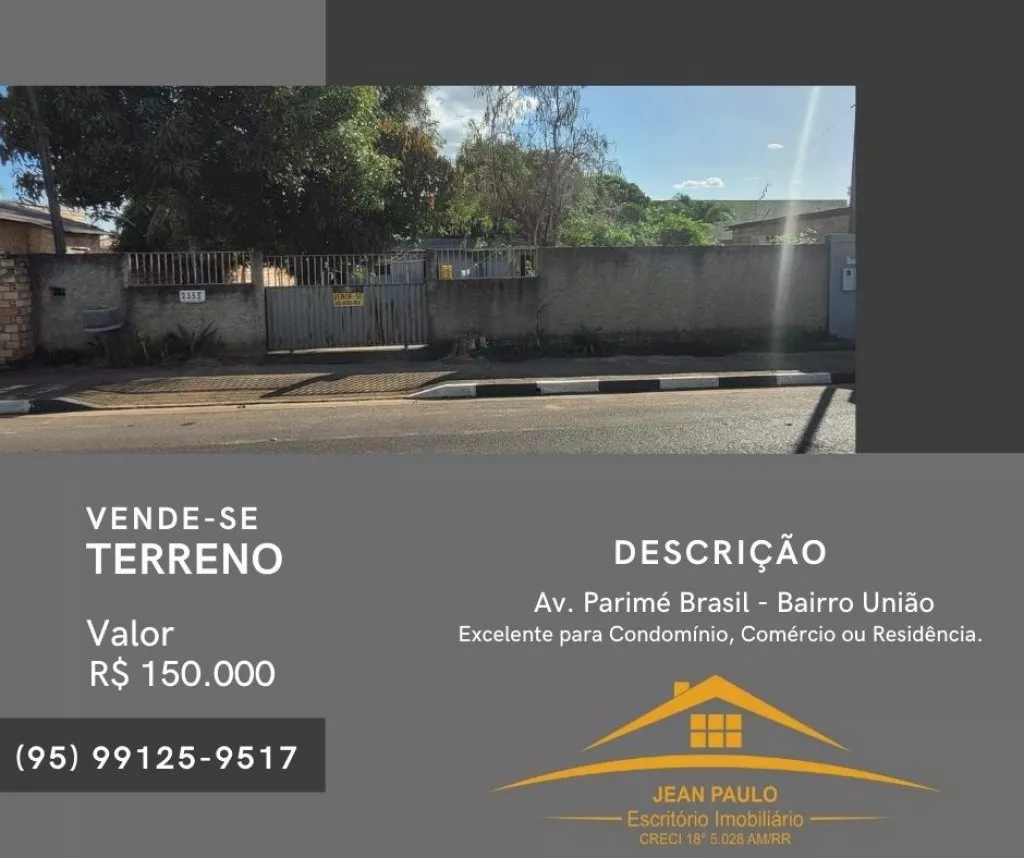 Vende-se este Terreno no na Av. Parimé Brasil, Bairro União Excelente para Condomínio, Comércio ou Residência.
